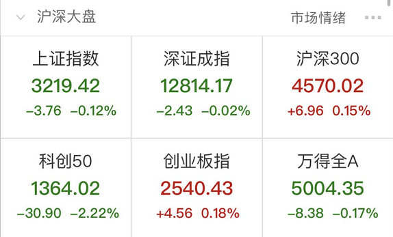 截止收盘,沪指下跌0.11%,深证成指下跌0.02%,创业板指数上涨0.18%。沪深两市共成交2206.74亿元,深市为3487.03亿元,两市合计成交5693.77亿元,比前一交易日的6607.54亿元明显缩量。